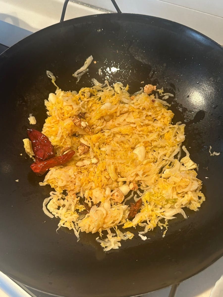 加入瀝乾的酸菜,繼續煎炒,直到開始變乾