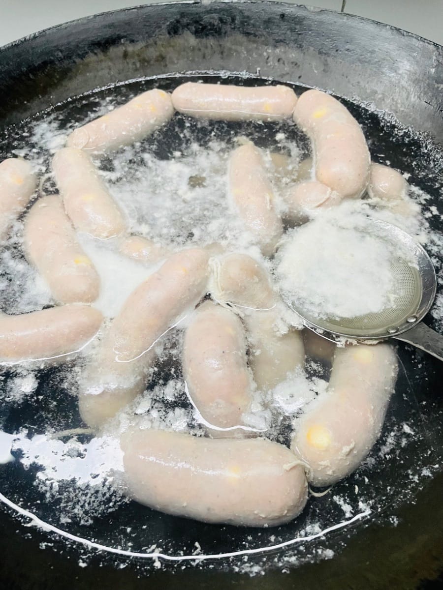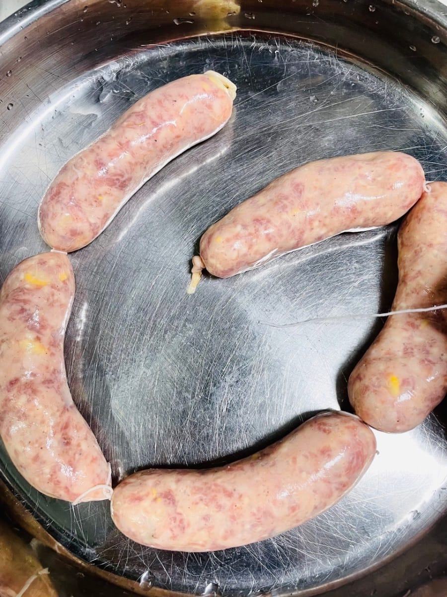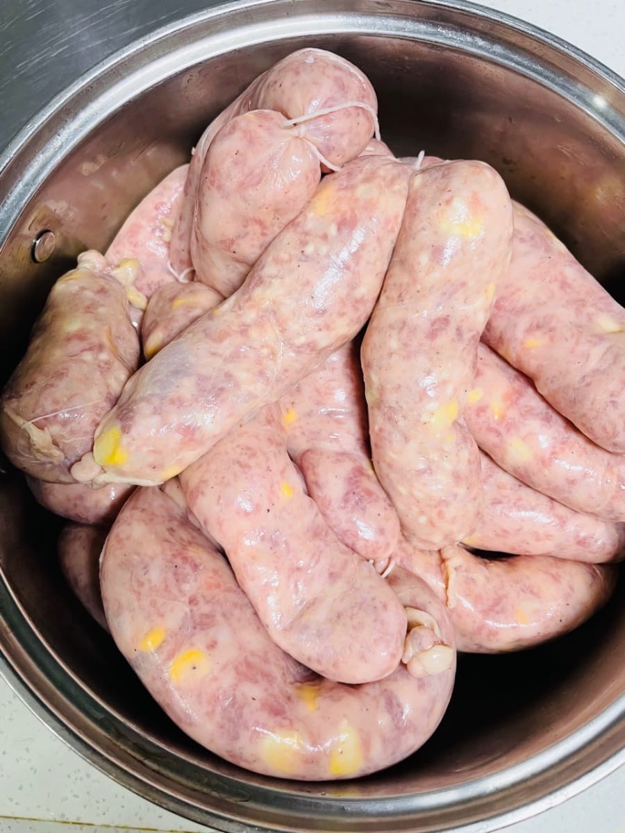 必須冷水下鍋,開最小的火慢慢煮(看視頻狀態,別讓水煲滾!大火煮會把腸衣沖爆,否則你會得到一鍋肉湯/糯米粥),煮20分鐘左右也再用牙籤收拾它~,煮50分鐘到1小時,它浮起嚟就熟了。