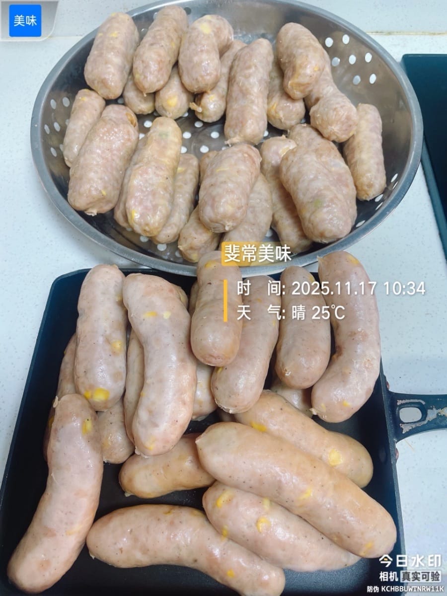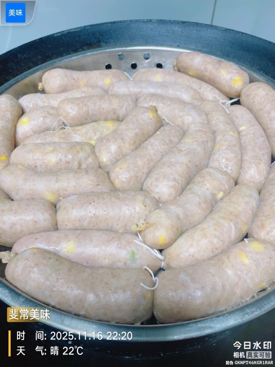 剛出爐的自製烤腸,油光裹著焦香往鼻尖鑽——先咬開薄韌的腸衣,「吱」地溢出裹著肉香的油潤,彈嫩的肉餡裡,瘦肉顆粒帶著嚼勁,肥肉泥又把軟潤裹滿舌尖。混了玉米粒的款,清甜會裹著肉鮮在嘴裡散開;加了糯米的則多了層黏糯的綿密,每一口都裹著紮實的香,鹹鮮裡藏著微微回甜,嚼起嚟既有肉的彈潤,又有穀物的軟香,油潤卻不膩口,熱口吃時的人連吃越快的肉連香