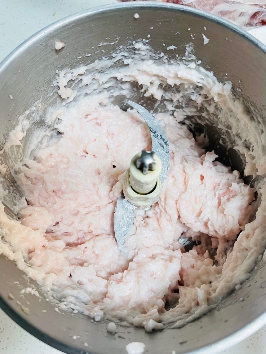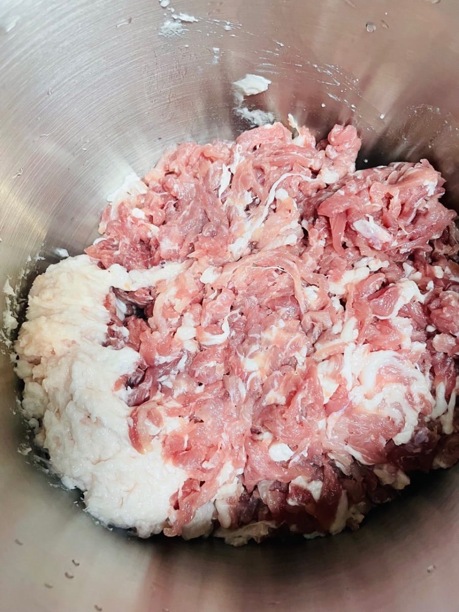 將含有肥肉和瘦肉豬腿肉分開切好,肥肉直接丟絞肉機裡絞成泥狀。