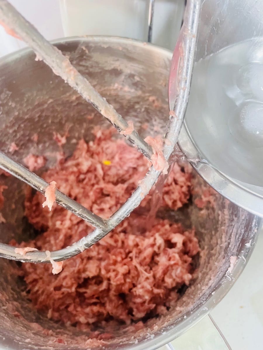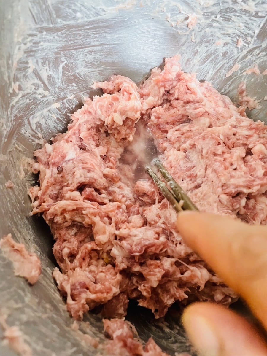 2. 調餡:加冰水分3次,順一個方向攪到插筷子能立住,這步決定烤腸Q彈口感,不能偷懶。