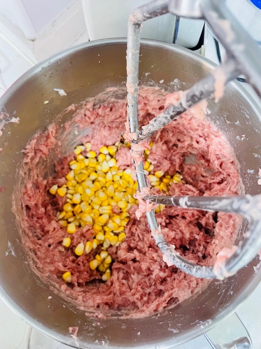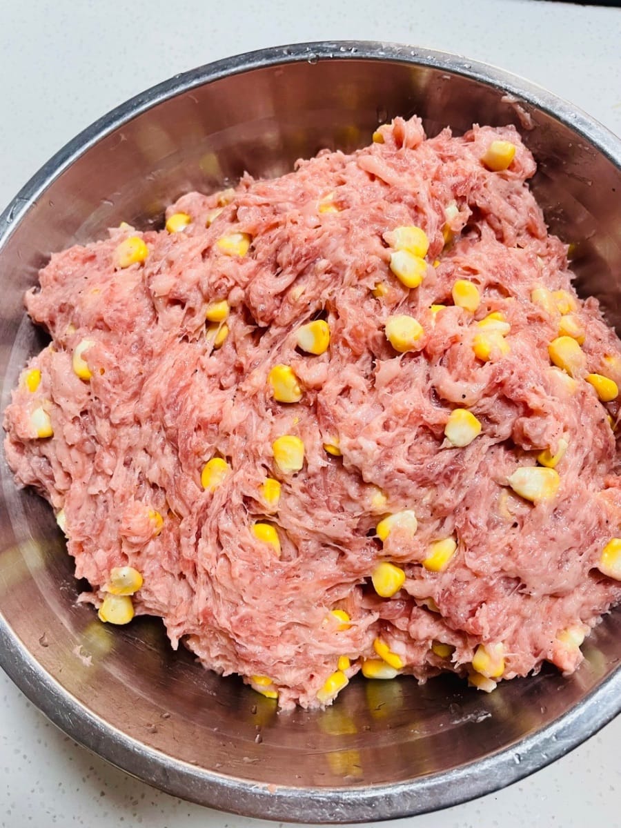 1. 肉米混合餡:用2斤肉搭配400克乾糯米(泡發後約500克)和250克玉米粒,混合均勻。