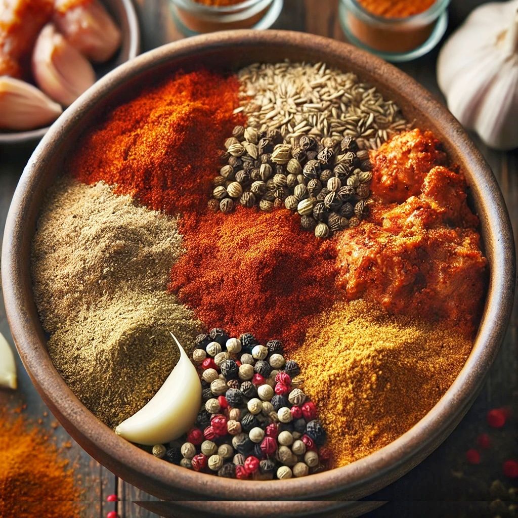 在一個小碗裡,混合紅椒粉、孜然、香菜、辣椒粉(如果使用)、蒜粉、洋蔥粉、鹽和胡椒。