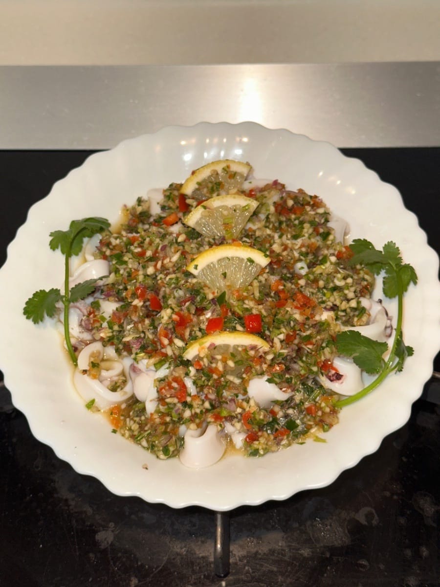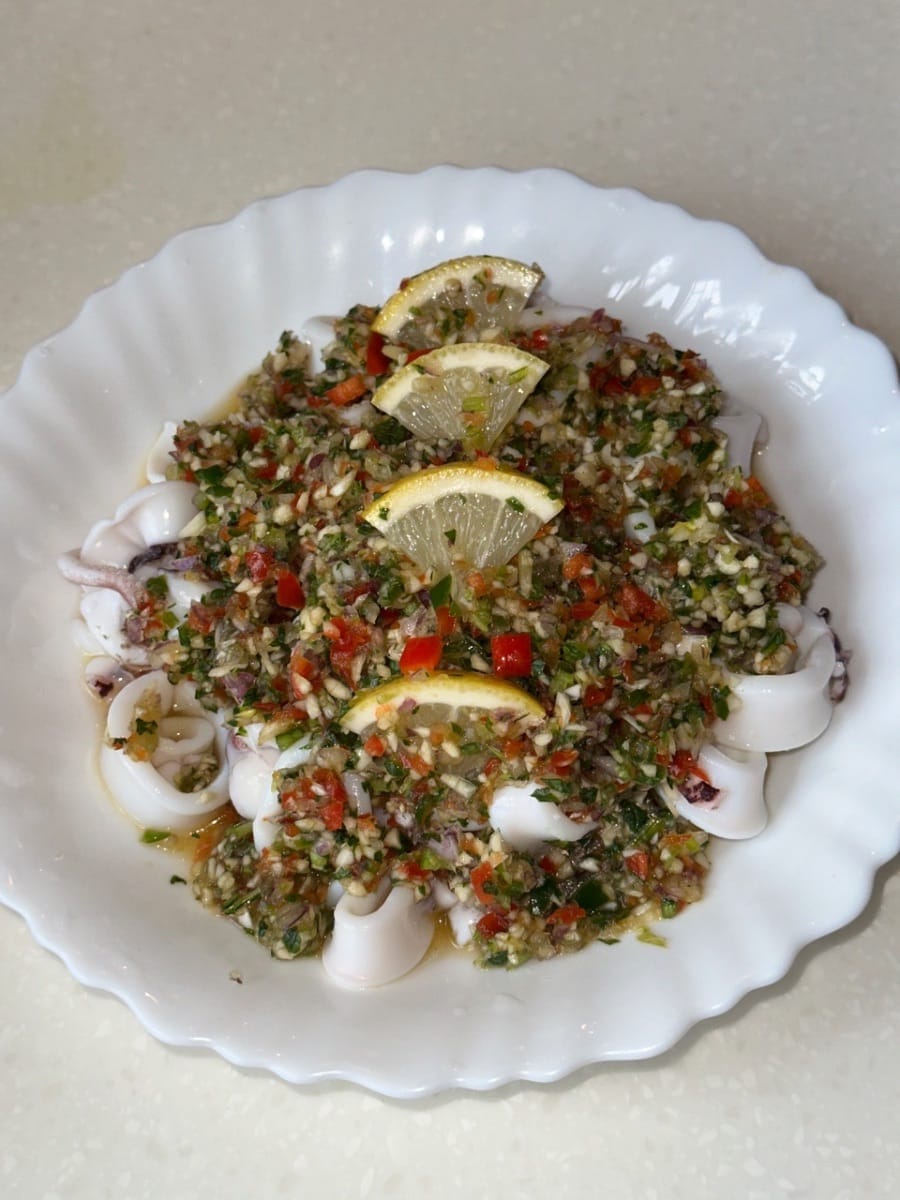 最後,加入檸檬片,並將醬汁淋在魷魚上。