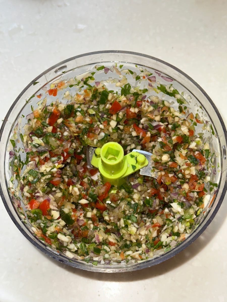 將紅辣椒、青辣椒、洋蔥、香菜根、薄荷葉和蒜瓣放入研磨機中。