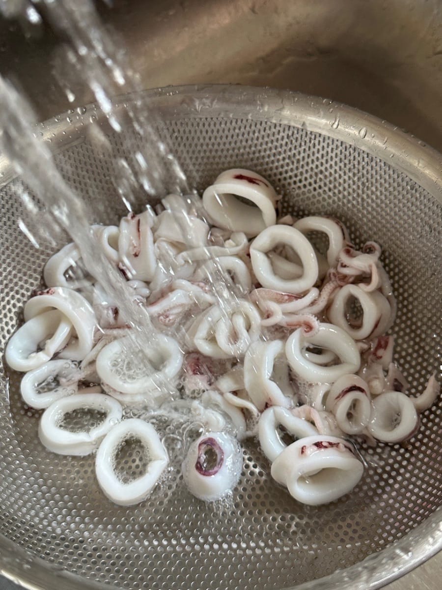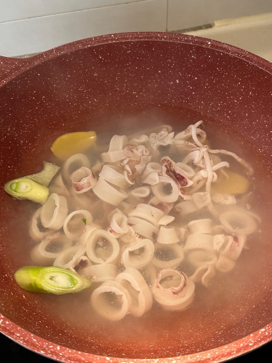 將魷魚放入滾水中,加入所需食材焯燙。焯燙 45-60 秒後撈出。