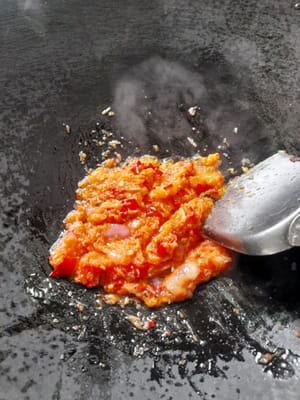 細磨香料; (8個紅蔥頭,5瓣大蒜,2個捲曲紅辣椒(可添加辣椒粉),1拇指大小的薑(壓碎)) 將細磨香料炒香,加入其他香料(2片月桂葉,4片撕碎的青檸葉,1根香茅,2公分高良薑,壓碎)。再次翻炒至香料完全“熟透”,並出油。