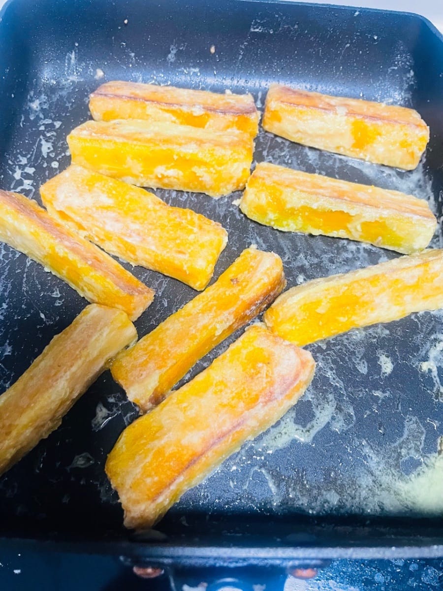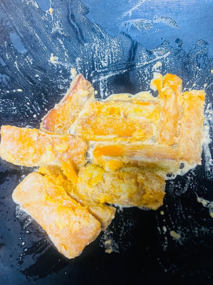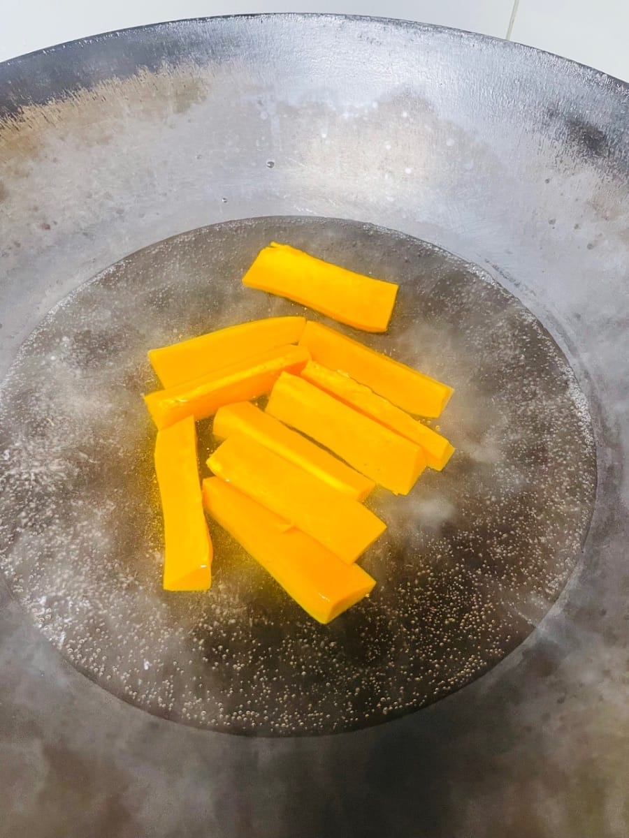 煎製南瓜:取不沾鍋,將裹好澱粉的南瓜條放入,小火煎約1分半鐘,注意不要老翻動,保持形態完整,煎好後盛出。 註:汆燙和煎都好注意時間,否則南瓜會不成形!
