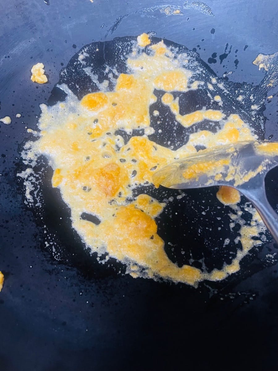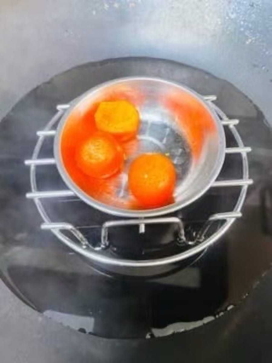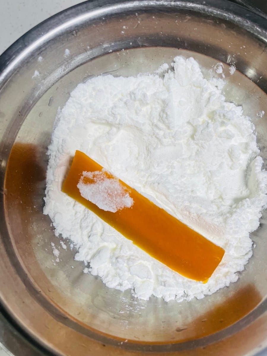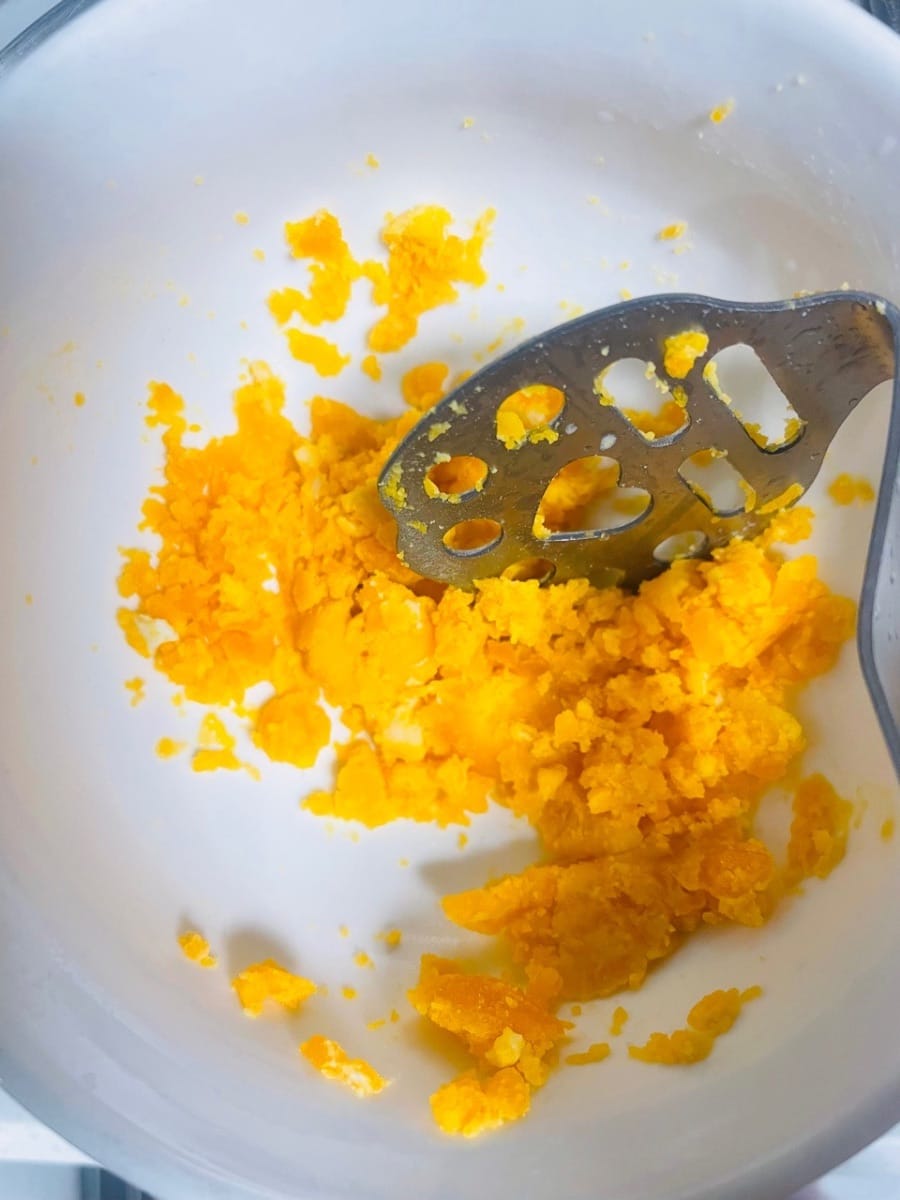 備鹹蛋黃:鹹蛋黃置於鍋中蒸熟,攞出嚟壓碎,製成碎末狀,備用。