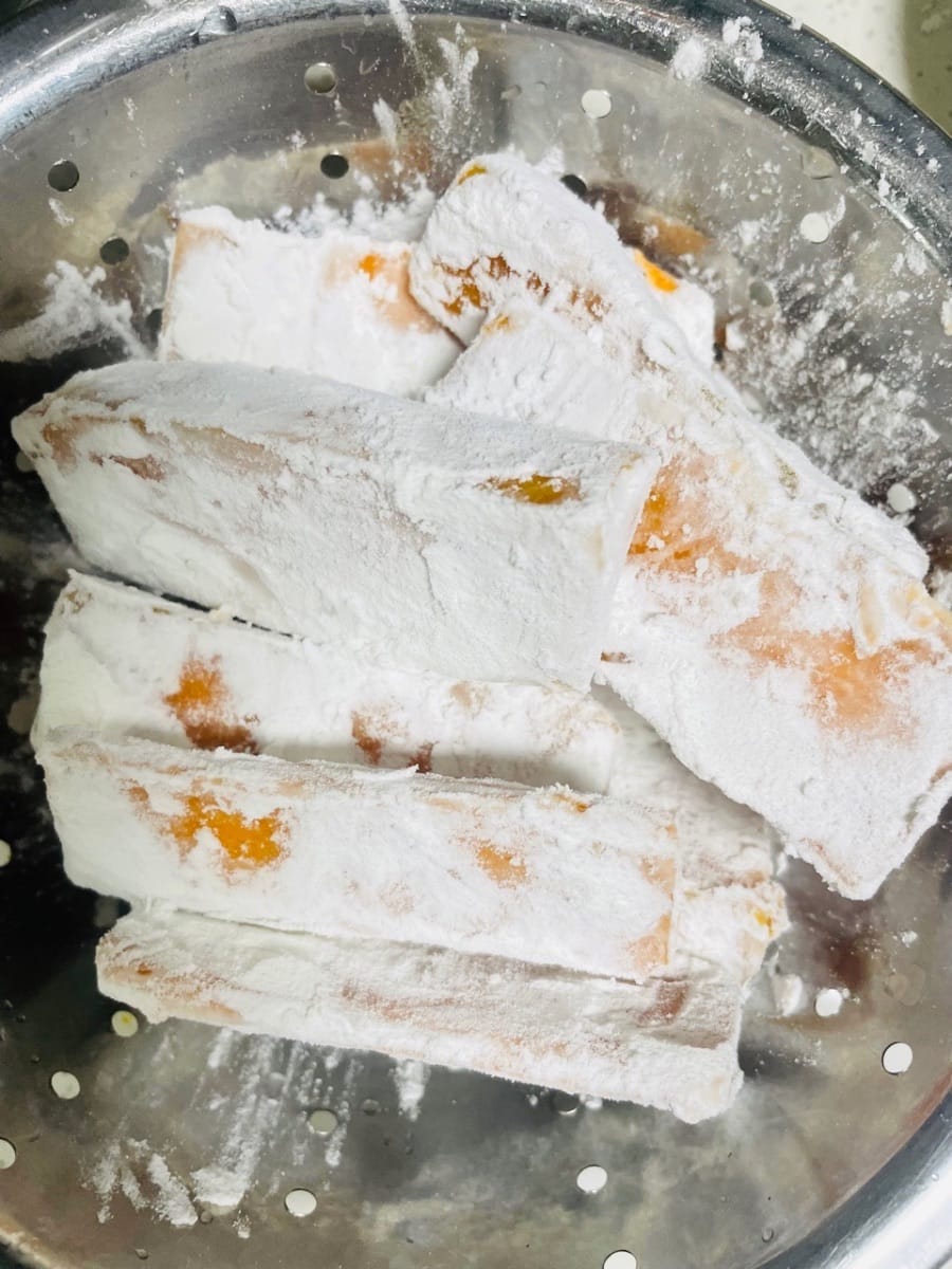 調味包皮:在南瓜條中加入少量鹽,拌勻調味,再均勻裹上薯仔澱粉,備用。
