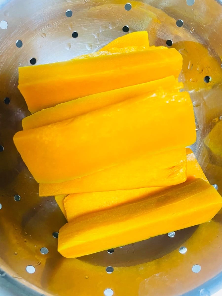 汆燙定型:鍋中燒水,水沸後放入南瓜條,汆燙1分鐘,撈出瀝乾水分,備用。