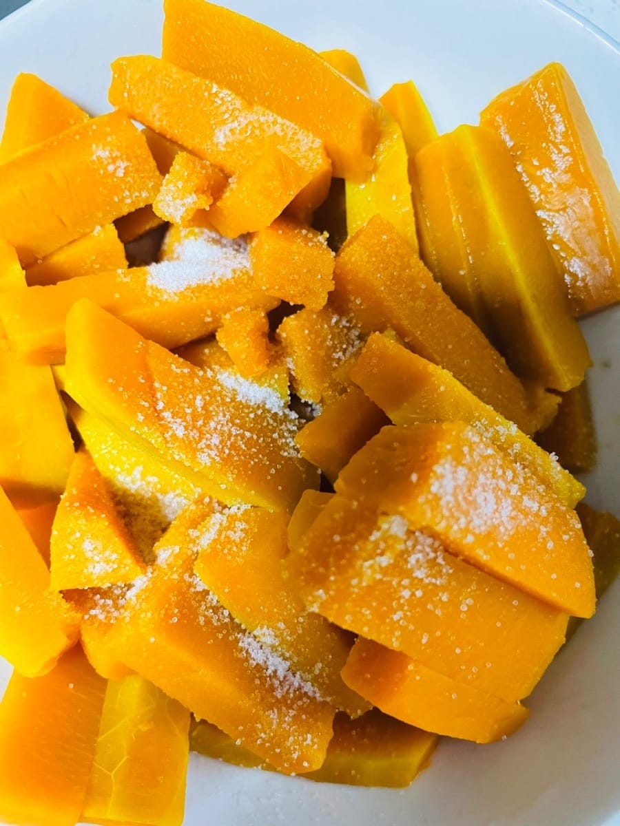 處理南瓜:取新鮮南瓜,削皮洗淨,切成長約8cm、寬約3cm的長條狀,備用。
