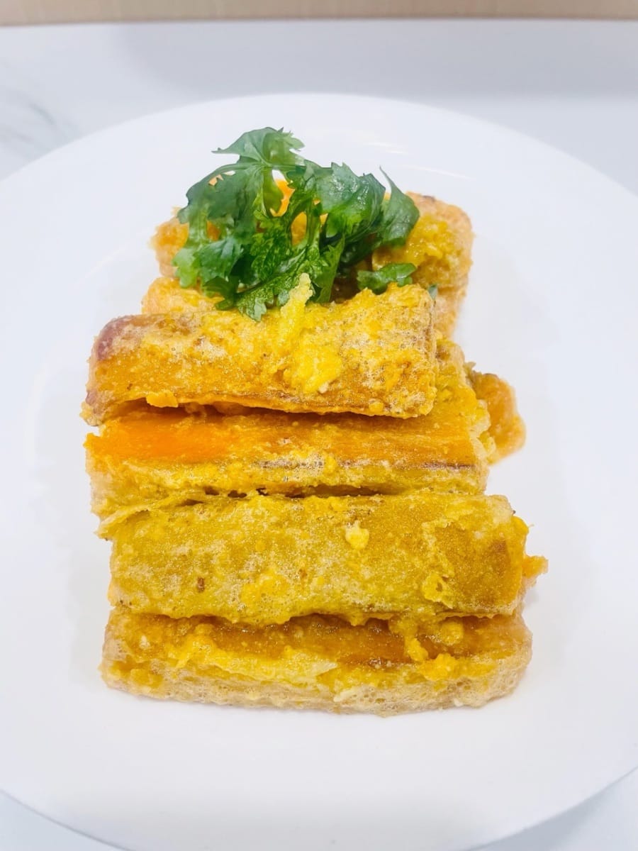 炒製裝盤:另起鍋,倒入少許油,放入壓碎的鹹蛋黃,小火翻炒至出現泡沫狀,加入煎好的南瓜條,輕輕翻炒均勻,即可出鍋裝盤。