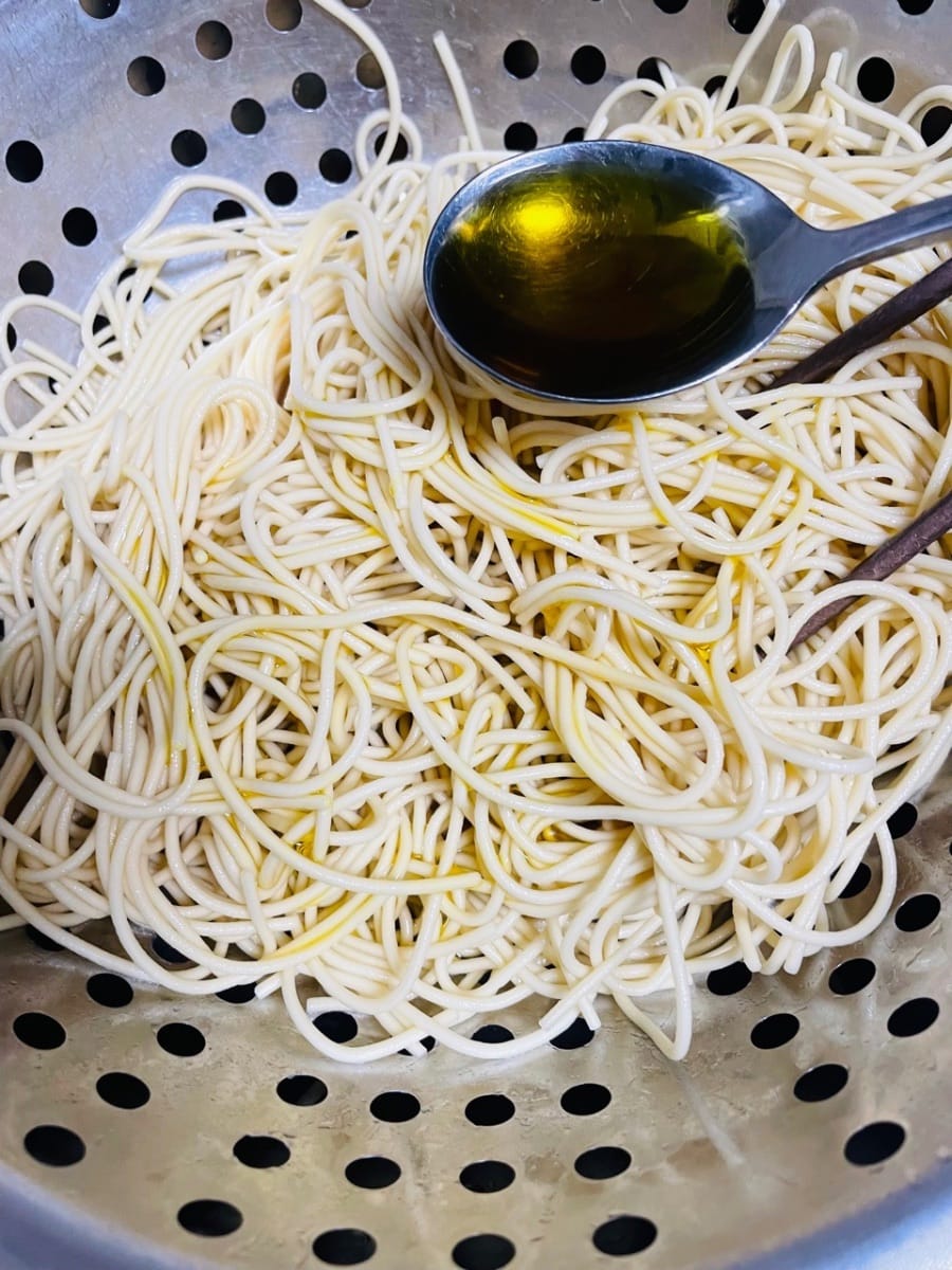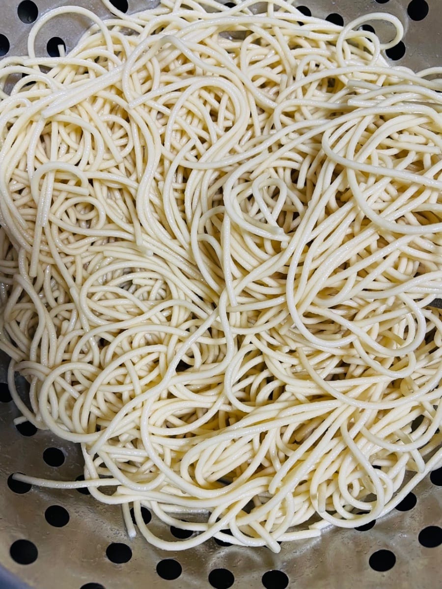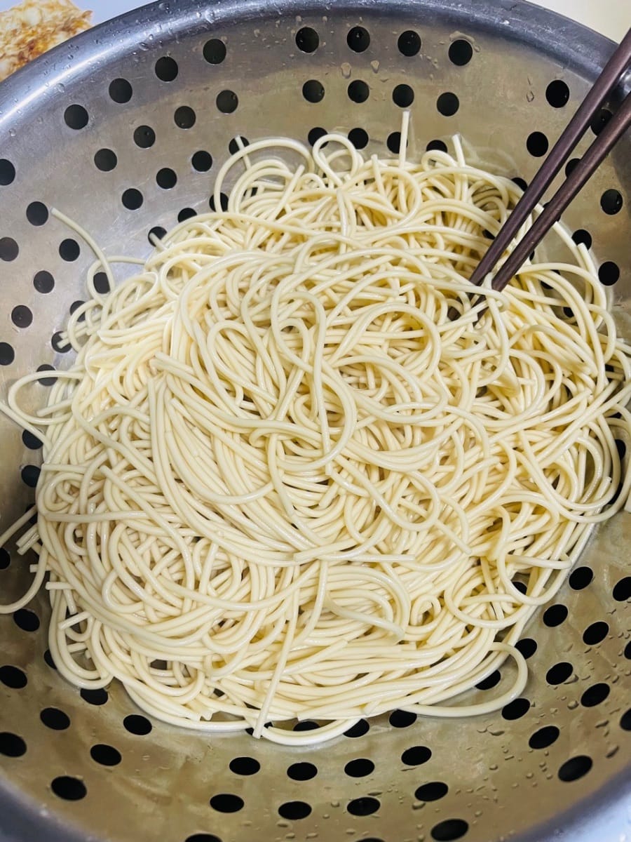 11. 鍋裡多放些水,燒開後放入鹼水面,水再次燒開後煮30秒 - 1分鐘,麵條呈有點斷生的狀態即可,馬上撈起,瀝乾水分,用電風扇吹涼,散去第一股熱氣時,放入熟蔬菜油,均勻攪拌,防止麵條粘連,同時增添香氣。