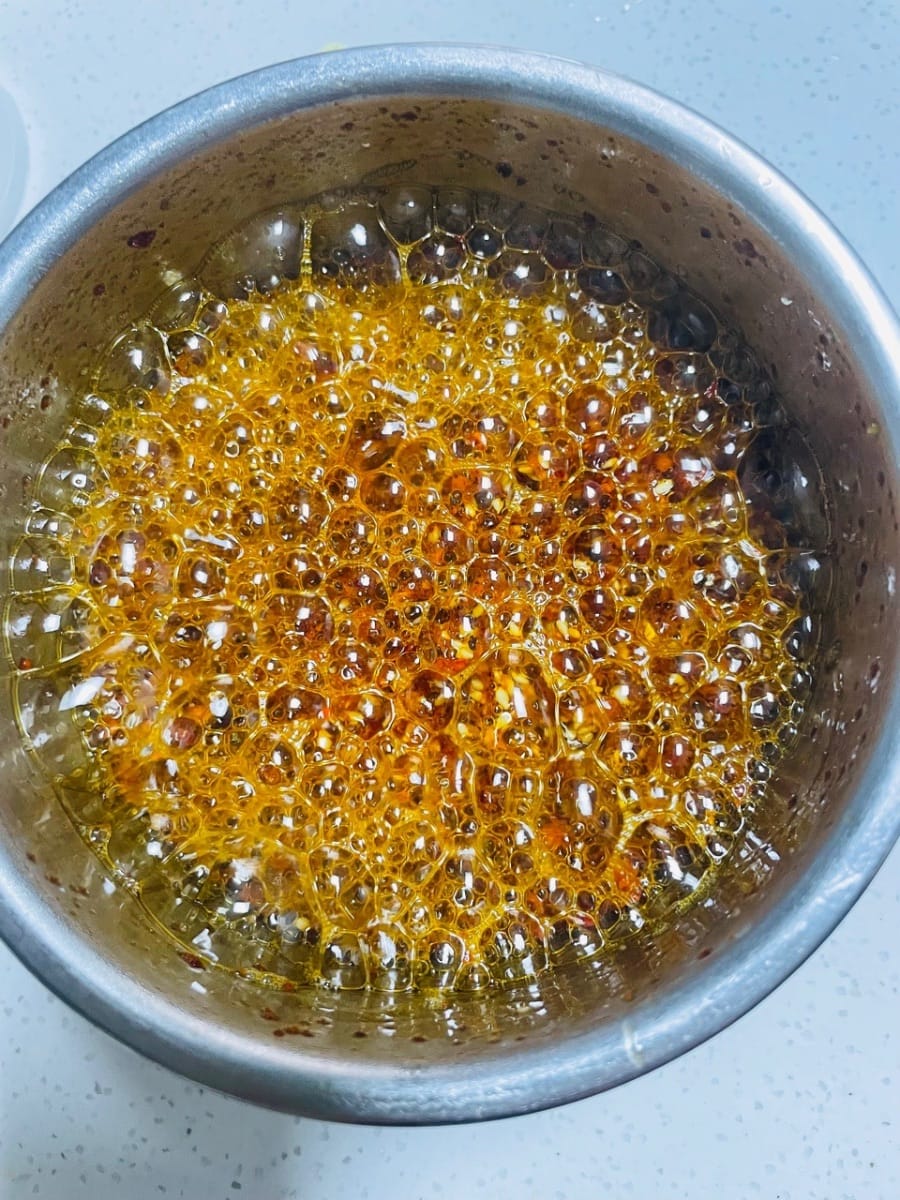 2. 待油溫降至6成熱時,將熱油淋入裝有辣椒粉和白芝麻的碗裡,注意油溫不能太高,否則會把辣椒粉燒糊,淋完後攪拌均勻,製成油辣子。