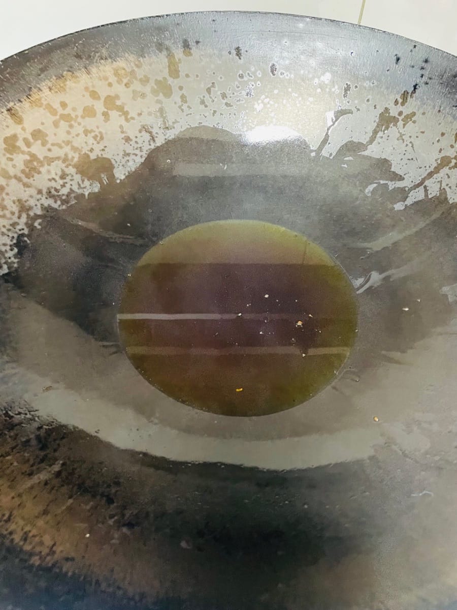 4. 鍋裡倒入菜籽油,燒至10成熱(油完全不冒煙且泡泡消失 ),然後等油溫冷卻到6成熱(先撈幾勺出嚟稍後扮麵條用),倒入備好的洋蔥片、薑片、蔥段、八角、桂皮、香葉,一起翻炒,炒渣至變黃後撈出。
