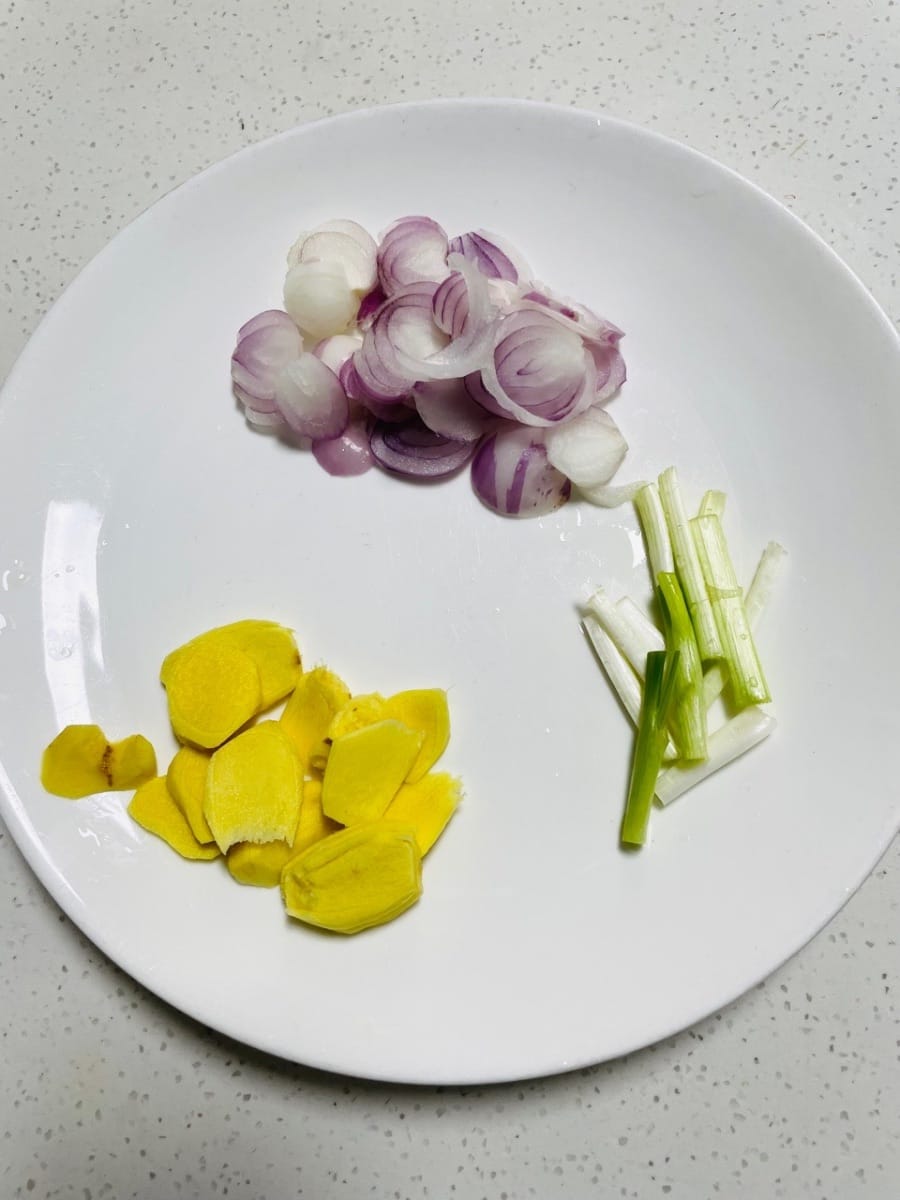 洋蔥切成片,薑切成片,蔥切成段,備用。