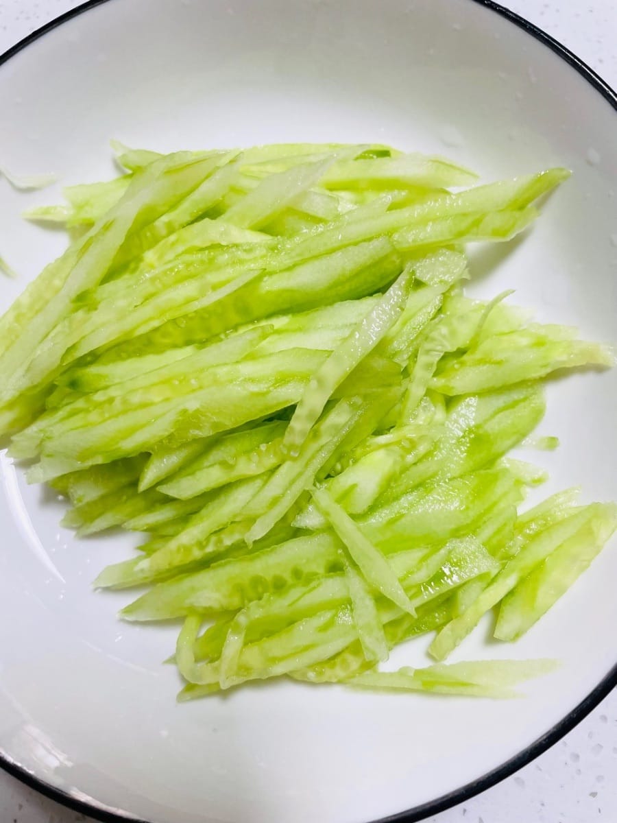 13. 將麵條放入大碗中,加入青瓜絲、綠豆芽,依序加入生抽 15 - 20 毫升、陳醋 10 - 15 毫升、白糖 5 - 8 克、鹽 1 - 2 克、雞精 1 - 2 克、花椒油 5 - 8 毫升、芝麻油 5 - 8 毫升、辣椒油 20 毫升 15毫升,再放入薑蒜末水、花椒粉攪拌均勻即可。