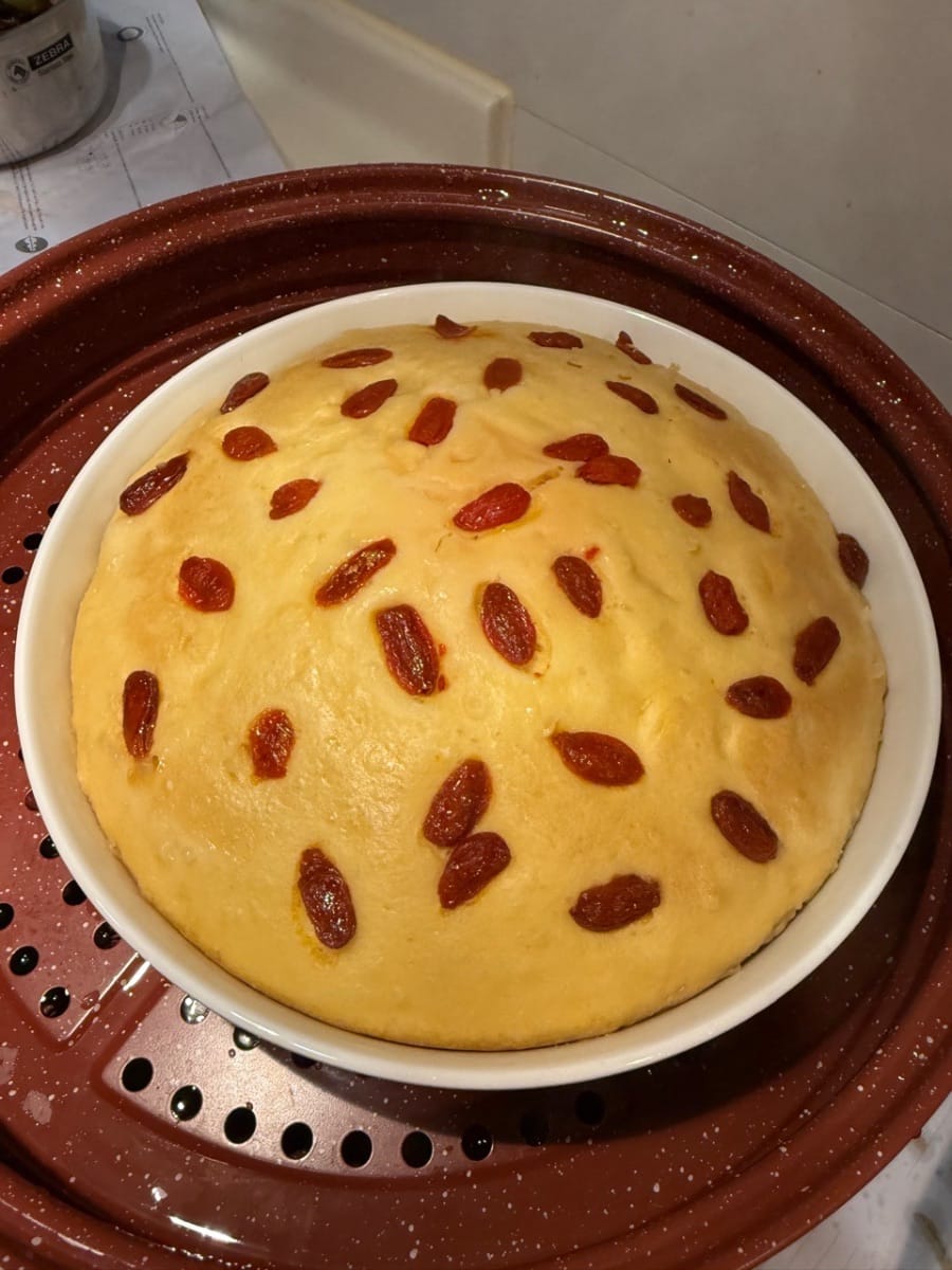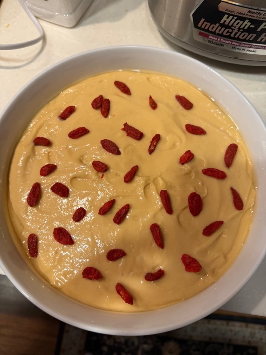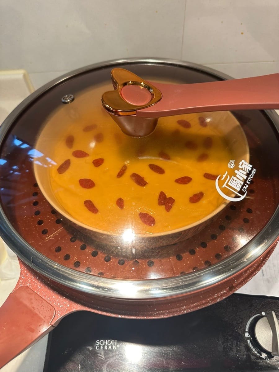 倒進已抹上油的容器,鋪上枸杞