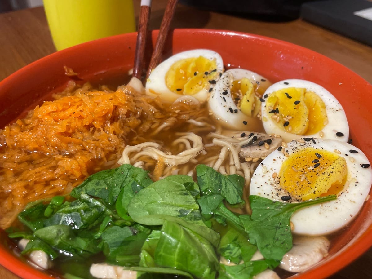 淋上您選擇的蔬菜、水煮蛋和肥肉。