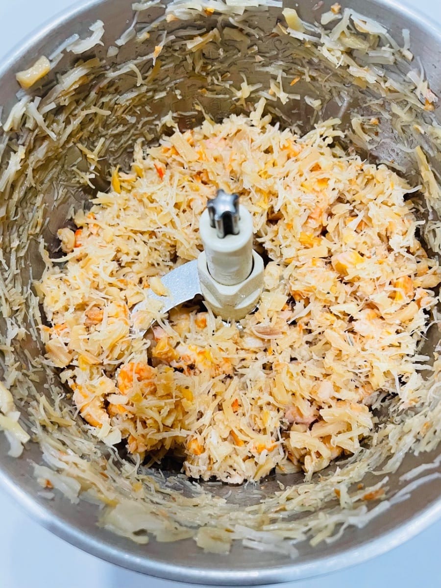 泡好的蝦米、瑤柱瀝乾水,為了讓它們和蘿蔔糕更融合,我用料理機攪成了細絲,你也可以直接切碎。