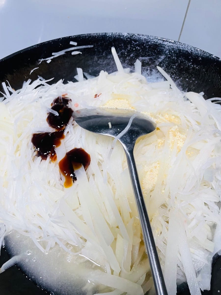 - 再放鹽、白胡椒粉、蠔油、雞精調味,蓋蓋煮5分鐘,讓蘿蔔入味。