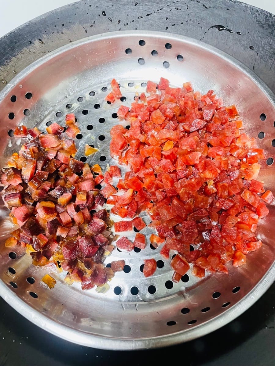 臘腸、臘肉先上鍋蒸15分鐘,蒸軟了再切碎,這樣切起嚟不費勁,炒的時候還能爆出油,香味更濃。