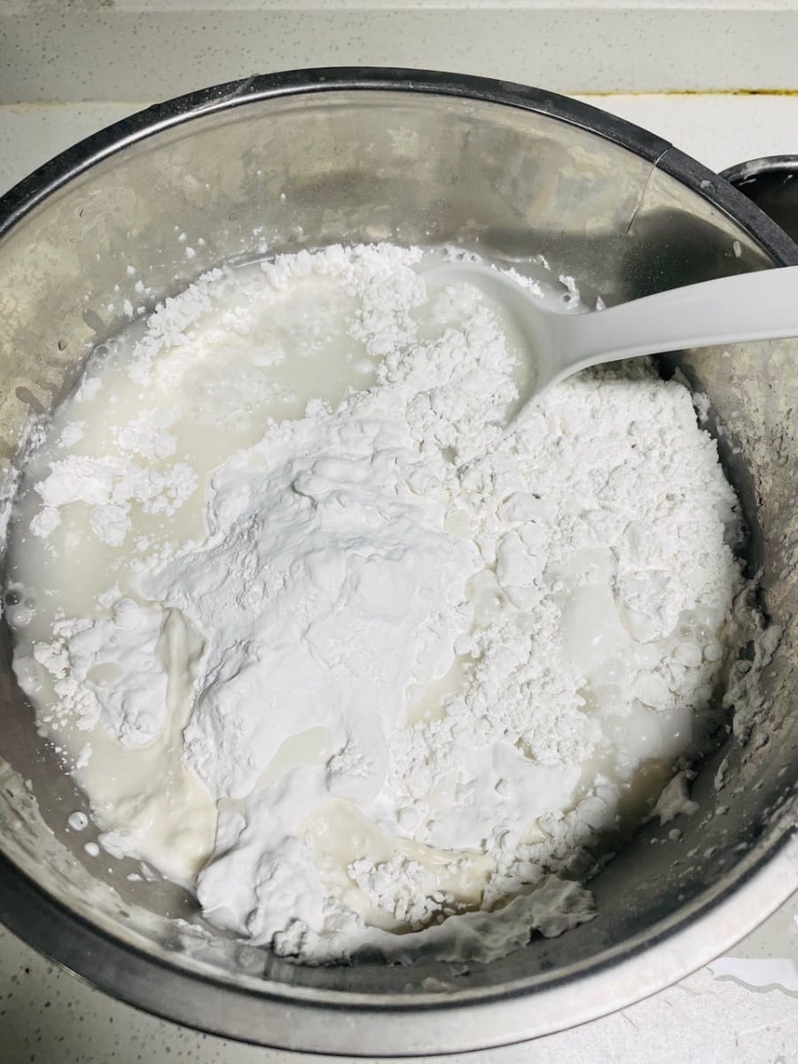 大盆裡倒600g黏米粉,加入調好的馬蹄漿,再倒入剩下的泡蝦米瑤柱的水,攪拌成均勻的粉漿。