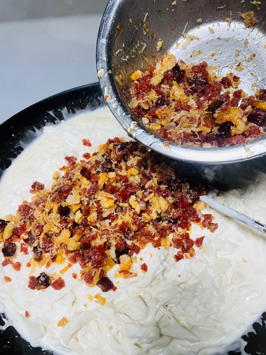 把之前炒好的臘味和蝦米瑤柱絲三分之二倒進去,翻拌均勻。