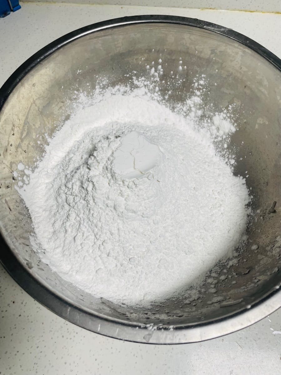 碗裡加50g馬蹄粉,用2-3匙泡蝦米的水調成流動的漿,過篩一遍更細膩,備用。