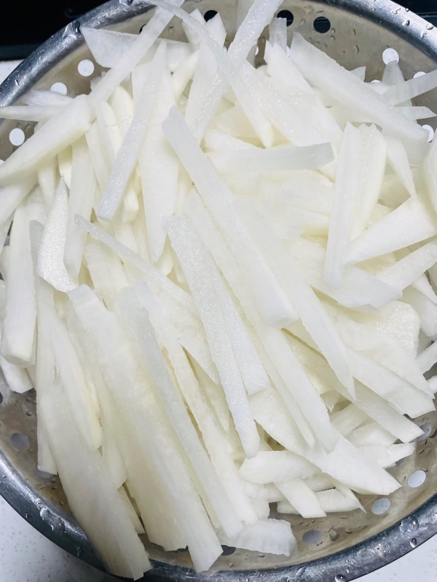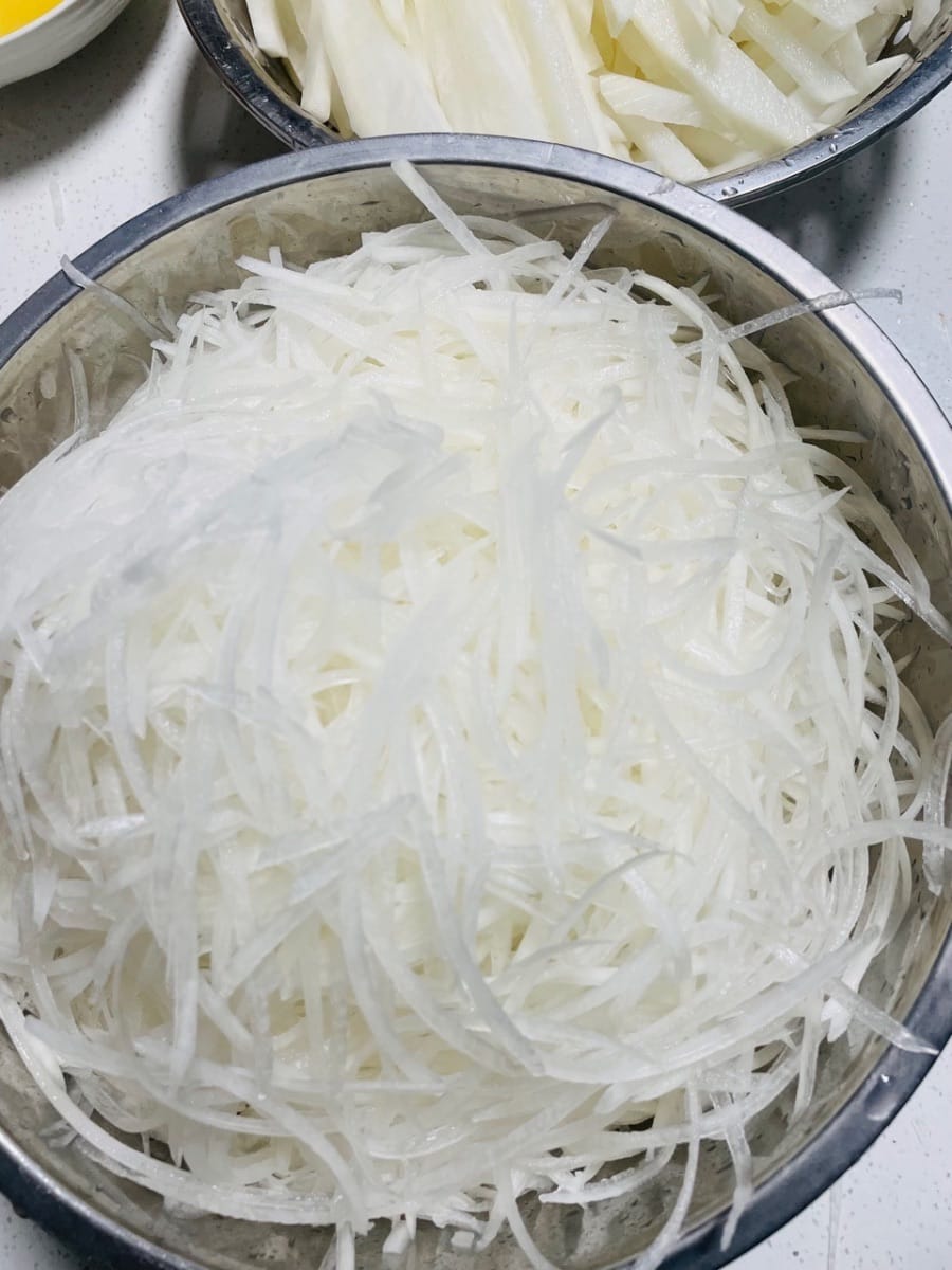 白蘿蔔去皮,2/3擦成細絲,1/3切成手指粗的條,這樣吃起嚟口感更豐富。