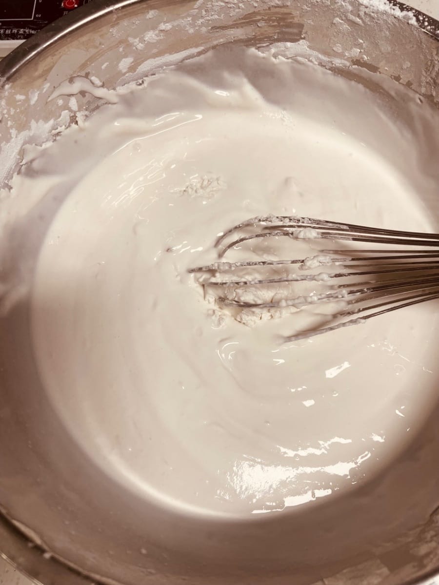 把煮好的蘿蔔絲撈出嚟,倒進粉漿裡攪勻;鍋裡剩下的蘿蔔汁燒開,關火後把粉漿倒進去沖燙,快速攪勻,這樣蒸出嚟的糕更Q彈。