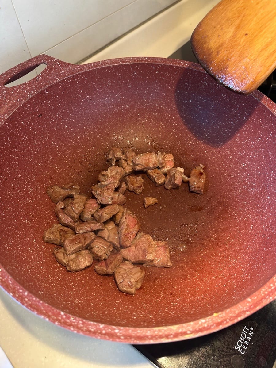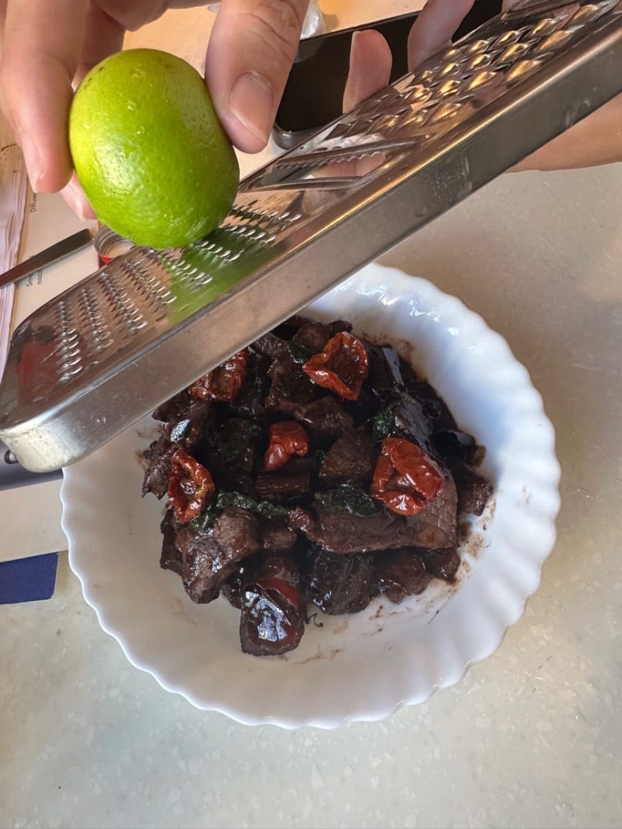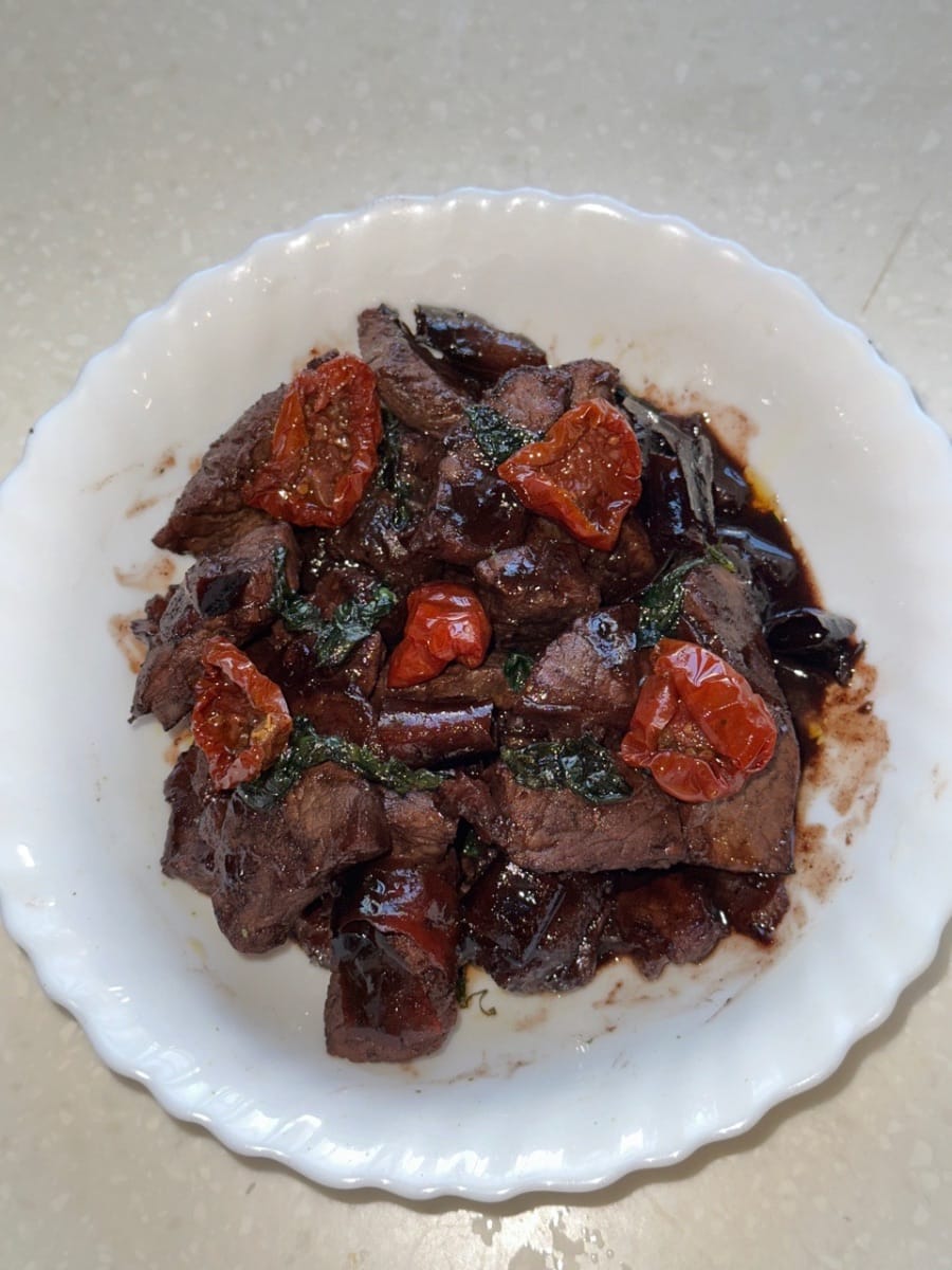 鮮嫩的牛肉塊煎至邊緣焦糖化,鎖住濃鬱的肉香。一層光澤亮麗的香醋醬汁均勻地塗抹在每一塊牛肉上,酸甜交織的複雜口感,更襯托出牛肉本身的鮮美。醬汁輕柔地包裹著牛肉,帶嚟一絲明亮的酸爽和淡淡的甜味,與牛肉的鹹鮮和醇厚完美融合。每一口都飽含濃鬱的肉香,餘韻悠長而精緻——濃鬱、平衡、優雅而醇厚。這道菜溫暖而富有層次感,是溫馨晚餐的完美之選,既令人感到舒適愜意,又不失精緻優雅。
