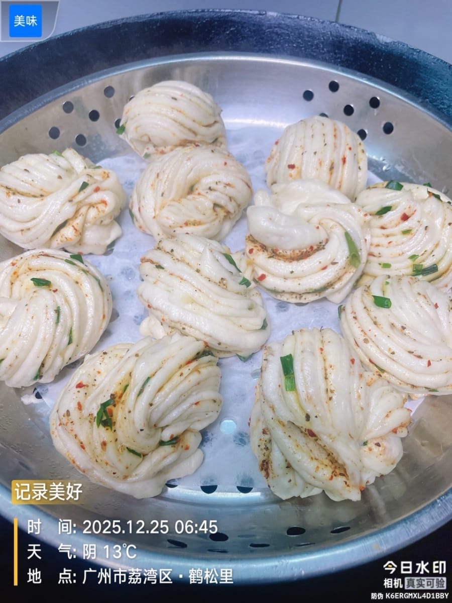蔥油花捲和椒香花捲簡直是碳水界的「王炸組合」!蔥油卷一掰開,蔥香混著面香直接往鼻子裡鑽,咬下去軟乎乎的,每一口都像在和「蔥香小炸彈」貼貼。椒香捲更絕,花椒的麻勁兒偷偷爬上舌尖,越嚼越上癮。成年人從不做選擇,兩種花捲必須一手一個,這麼香的花捲,減肥?那是明天的事!